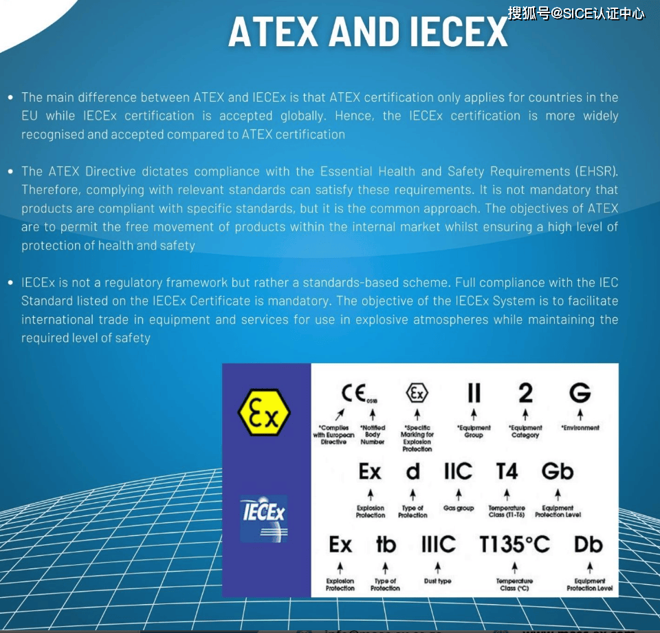 🔹 IECEx – 这是一个由 IEC(国际电工委员会)管理的全球认证体系。它为参与国家/地区的防爆认证提供了标准化方法,帮助制造商简化合规性并进入多个市场,而无需重复测试。