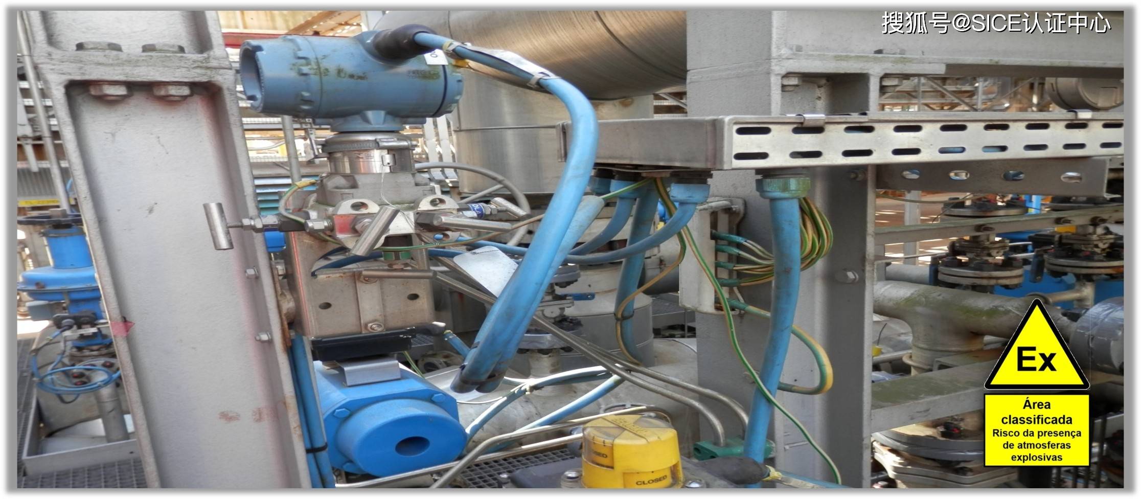 控制、仪器和自动化回路的布线和电缆分配系统安装示例,通过托盘和电缆槽,并通过“Ex”电缆压接装置在电缆进入的区域,这些区域在陆地上(化工厂)被分类为易燃气体和可燃粉尘。