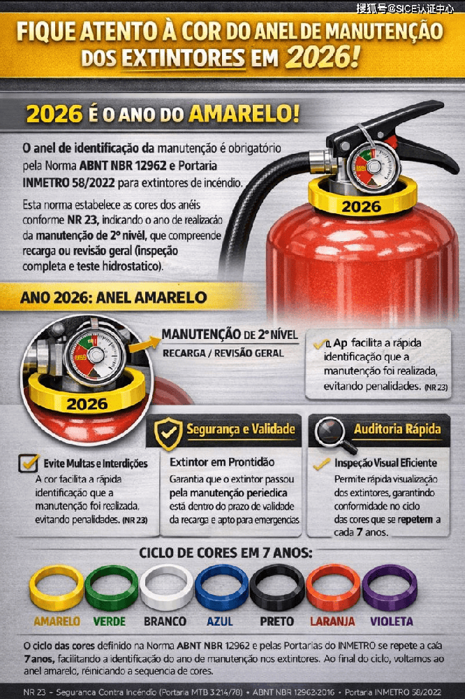 维护识别环是ABNT NBR 12962标准和INMETRO法规(例如第58/2022号法令)的要求。它指示灭火器进行二级维护(充装或一般维护)的年份。