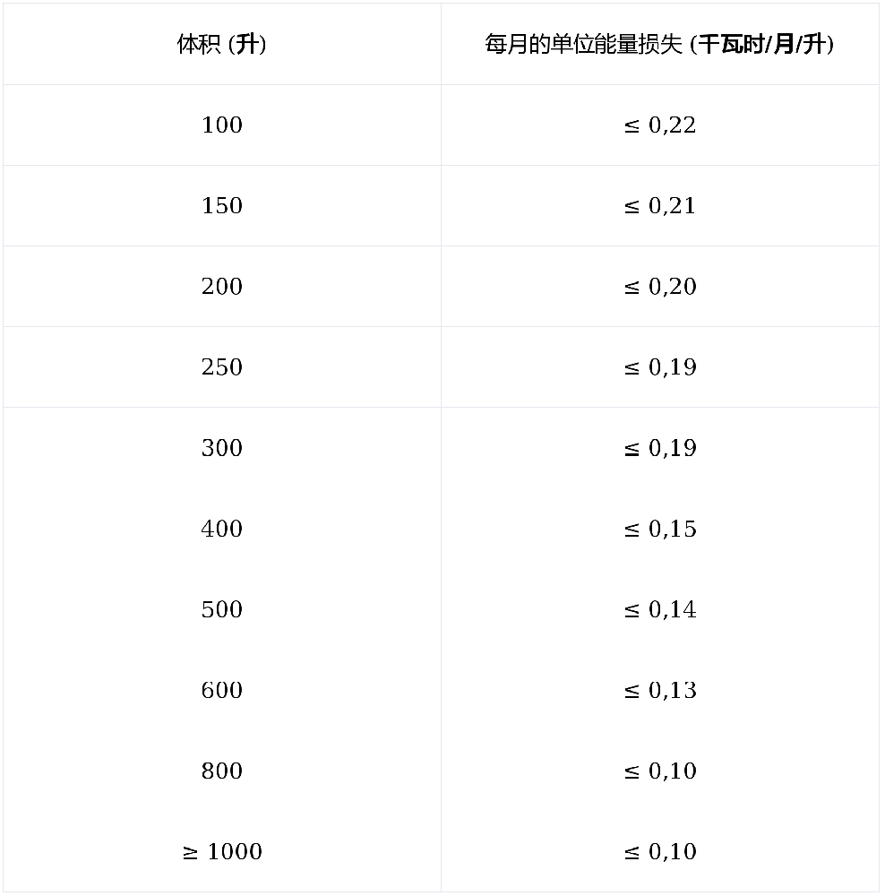 例如,下表列出了授予太阳能集热器A级所需的最低要求,以每月能源浪费为单位: