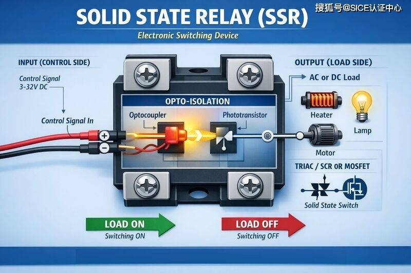 固态继电器(SSR)是一种电子开关装置,当向控制端子施加微小电流时,它会切换电流的流向。SSRS由响应适当输入(控制信号)的传感器、一个开关负载电路的固态电子开关,以及一个控制信号耦合机构组成,该开关无需机械部件即可激活该开关。继电器可以设计为切换交流电或直流电。它执行与机电继电器相同的功能,但没有运动部件。