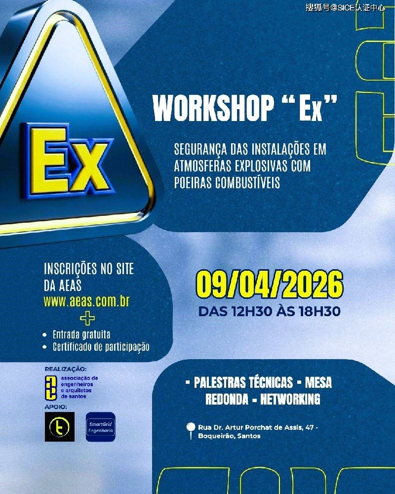 2026年4月9日,在 Associação de Engenheiros e Arquitetos de Santos (AEAS)举办“Ex”研讨会:在存在可燃尘埃的爆炸性环境中设施的安全。
