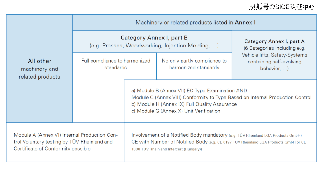 符合性评估是一种用于确定机械及相关产品是否符合适用的健康和安全要求的程序。新法规的附件 I 列出了需要由指定机构支持的特殊符合性评估程序的机械。该列表分为 A 部分(必须有指定机构的参与)和 B 部分(按照 2006/42/EC 附件 IV 机械的程序)。一个创新是与内部生产控制相关的型式符合性模块。制造商负责根据 EC 型式检查执行此程序。另一个新特点是“单元验证”模块,在此模块中,指定机构对单台特别是复杂的机械进行测试和认证。