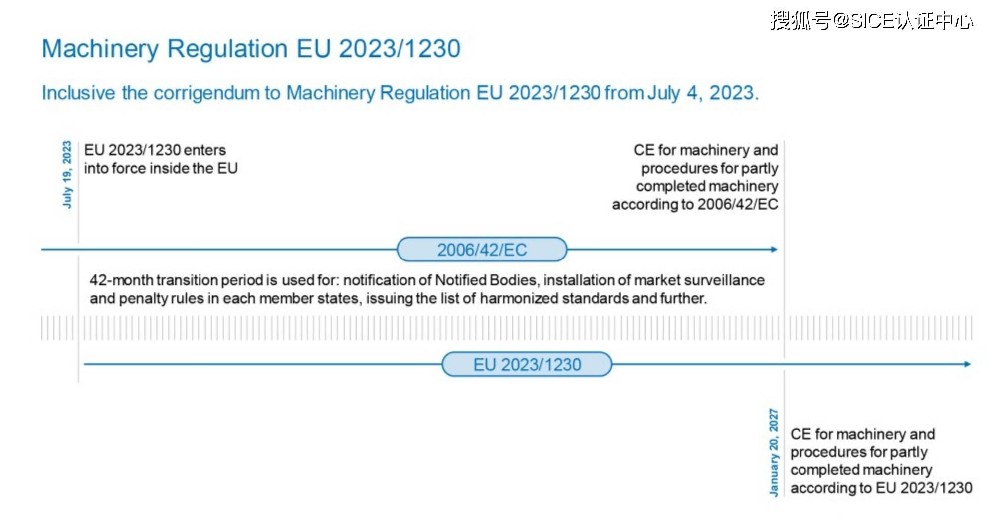 2023年6月14日,新的机械法规欧盟2023/1230发布。该法规将取代现行的机械指令2006/42/EC,自2027年1月20日起生效。从此之后,机械的CE认证和未完成机械的评估将只能依据欧盟2023/1230进行。然而,在2027年1月19日结束的42个月过渡期内,机械指令2006/42/EC将继续有效。不会有一个同时适用两部法律的过渡期。尽管如此,依据欧盟2023/1230进行的测试和相关证书已经可以颁发。